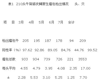 (2)牛皮蠅血清抗體監(jiān)測(cè)結(jié)果。引進(jìn)法國特異的ELISA檢驗(yàn)技術(shù),對(duì)流行區(qū)25頭牛逐月采血,經(jīng)1年監(jiān)測(cè),被檢牛的各月血清均呈牛皮蠅抗體陽性,從10月至翌年3月均保持高峰,然后抗體效價(jià)逐漸降低,于春末夏初達(dá)最低值。隨著牛皮蠅成蟲的出現(xiàn),牛再次感染,抗體會(huì)有一個(gè)大的增高,這種感染發(fā)生于6~9月。據(jù)此可以得出兩個(gè)結(jié)論:一是當(dāng)?shù)嘏Fは壔顒?dòng)季節(jié)在每年的6~8月,二是每年的9~10月為藥物防制最佳時(shí)期。