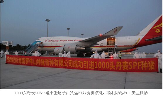 北京時(shí)間2016年4月25日下午18時(shí)35分,一架來(lái)自北歐的貨運(yùn)B747貨機(jī)航班徐徐降落在美蘭機(jī)場(chǎng),滿載著羅牛山引進(jìn)的1000頭丹麥SPF種豬抵達(dá)??凇U麢C(jī)共22塊三層豬籠,共運(yùn)載種豬約1000頭。此批SPF原種豬,是為新建的海南羅牛山十萬(wàn)頭現(xiàn)代化豬場(chǎng)引進(jìn)的優(yōu)質(zhì)種豬,是羅牛山畜牧產(chǎn)業(yè)轉(zhuǎn)型升級(jí)的重要舉措。