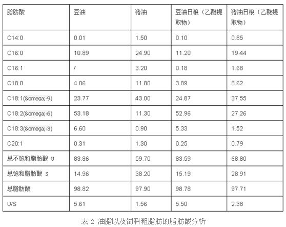 2 基礎(chǔ)日糧: 3 油脂的體外試驗(yàn)和分析 從表2的油脂分析的實(shí)驗(yàn)結(jié)果我們知道,豆油和豬油以及豆油型日糧和豬油型日糧的粗脂肪的脂肪酸譜差異都是非常大的,豆油的U/S值是豬油的3.6倍,雖然豬油型日糧受到植物性原料的所含油脂的影響,但是豆油型日糧的U/S值同樣也是豬油型日糧的2.31倍。