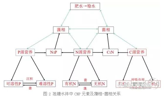 池塘水體中,主要的營養(yǎng)元素有碳、氮、磷、鉀及礦物質(zhì)元素這5大類。其中,水體N、P比決定著水體藻相的變化,重點體現(xiàn)了池塘水體的肥度和肥水效果;而C、N比則決定著池塘水體菌相的變化,重點體現(xiàn)了池塘水體的“穩(wěn)度”和水體穩(wěn)定效果。只有在池塘水體“菌相-藻相”互相平衡的時候,池塘水體才能夠保持較好的穩(wěn)定性。