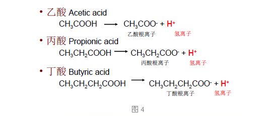 瘤胃發(fā)酵產(chǎn)酸是揮發(fā)性脂肪酸,主要是乙酸、丙酸、丁酸。在正常情況下,主要是瘤胃的微生物分解脂肪酸,這些脂肪酸被瘤胃微生物制造出來以后馬上分離,變成乙酸和離子,氫離子就會分解出來。(圖4)