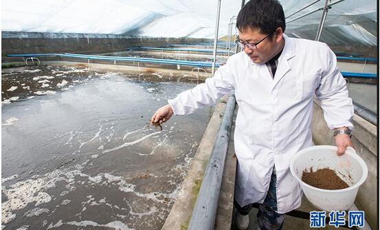2月15日,新疆巴里坤哈薩克自治縣海子沿鄉(xiāng)多種養(yǎng)殖基地的工作人員給南美白對(duì)蝦喂食。