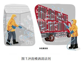 使用低壓或噴霧水槍對車體外表面、車廂內(nèi)表面、底盤、車輪等部位噴灑稀釋過的消毒液(圖8),以肉眼可見液滴流下為標(biāo)準(zhǔn)。