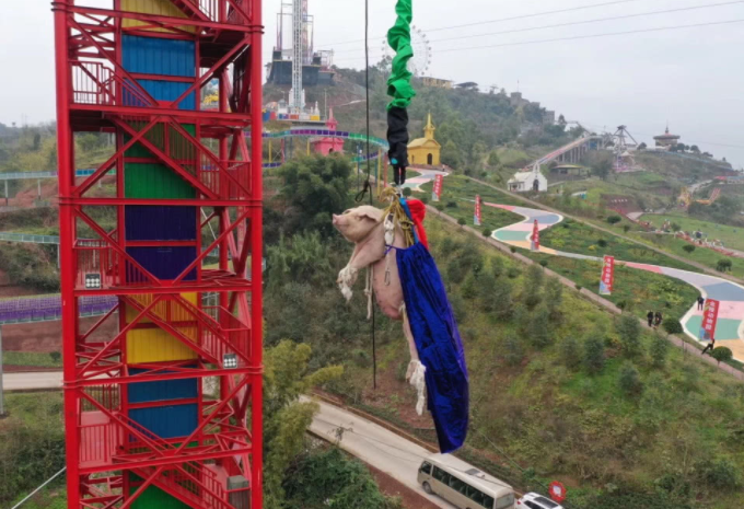 現(xiàn)場視頻顯示,幾名工作人員將一頭肥豬綁好安全繩、做完防護措施后,便將豬推下蹦極臺。系著安全繩索的肥豬在空中蕩來蕩去,蹦極臺下方是水面。