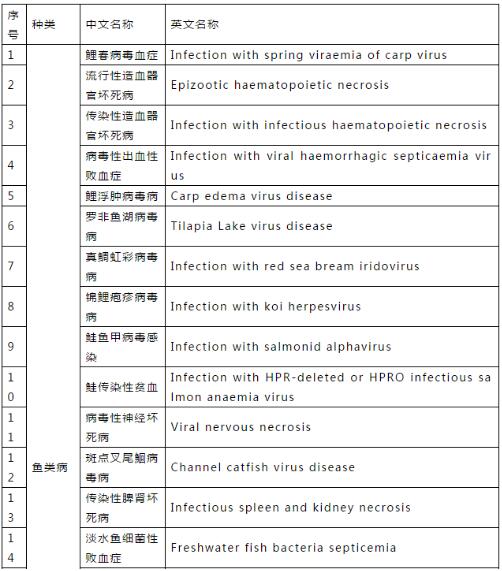 修訂后的《名錄》,包括水生動物疫病43種,均被列為二類進境疫病。新增了7種水生動物疫病,分別為:鮭魚甲病毒感染、鯉浮腫病毒病、羅非魚湖病毒病、細(xì)菌性腎病、急性肝胰腺壞死、十足目虹彩病毒1感染(蝦虹彩病毒?。┖拖旙⒒【腥?;刪除了8種水生動物疫病,分別為:對蝦桿狀病毒病、斑節(jié)對蝦桿狀病毒病、小瓜蟲病、黏孢子蟲病、 指環(huán)蟲病、河蟹顫抖病 、鮑膿皰病和鱉腮腺炎病。