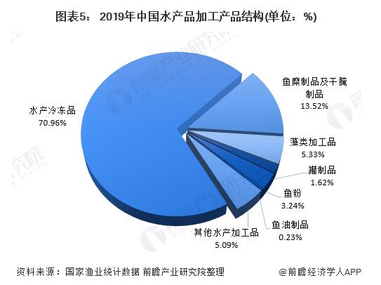 我國(guó)水產(chǎn)品加工產(chǎn)品主要包括水產(chǎn)冷凍品,魚(yú)糜制品及干腌制品等。2019年,我國(guó)水產(chǎn)冷凍品加工量占水產(chǎn)品加工產(chǎn)品量的70.96%;魚(yú)糜制品及干腌制品占到了13.52%。