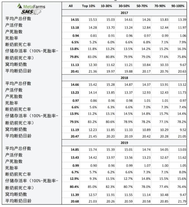 該報(bào)告由美國養(yǎng)豬數(shù)據(jù)公司MetaFarms及子公司SMS具體制作,所用數(shù)據(jù)為其系統(tǒng)中至少建檔3年以上的美國豬場的數(shù)據(jù),2019年該數(shù)據(jù)集涵蓋母豬場600個(gè),母豬1,588,246頭,保育豬15,666,136頭,育肥豬17,479,763頭,斷奶到育肥豬8,023,610頭。