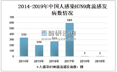 2017年中國人感染H7N9禽流感發(fā)病數(shù)589例,為近年來人感染H7N9禽流感發(fā)病數(shù)最多的一年,2018年中國人感染H7N9禽流感發(fā)病數(shù)2例,2019年中國人感染H7N9禽流感發(fā)病數(shù)只有1例。