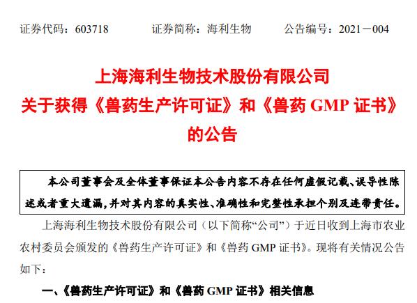 海利生物獲新的《獸藥生產許可證》和《獸藥 GMP 證書》