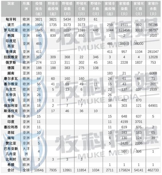 2020年,13個(gè)歐洲國家(匈牙利、波蘭、羅馬尼亞、拉脫維亞、俄羅斯、德國、摩爾多瓦、塞爾維亞、烏克蘭、保加利亞、斯洛伐克、比利時(shí)、希臘)、9個(gè)亞洲國家(韓國、印度尼西亞、菲律賓、越南、東帝汶、中國、印度、老撾、緬甸)、3個(gè)非洲國家(南非、塞拉利昂、贊比亞)、1個(gè)大洋洲國家(巴布亞新幾內(nèi)亞)報(bào)告了非洲豬瘟疫情。其中,匈牙利共報(bào)告了3821起非洲豬瘟疫情,居首位。