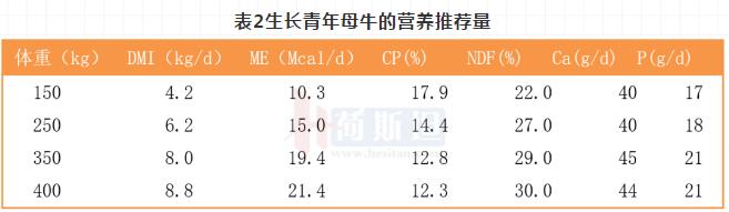 在青年母牛頭6個月的生活中,她的營養(yǎng)需要量是相當(dāng)大的。表2列出生長青年母牛的營養(yǎng)推薦量。