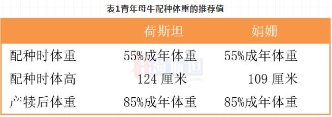 根據(jù)體重配種需要確定牛群的平均體重和在第三胎或三胎以上測定的體高,以及滿足這一體重和月齡目標(biāo)所需的目標(biāo)平均日增重(ADG)。表1列出了荷斯坦青年母牛和娟姍青年母牛配種體重的行業(yè)推薦值。