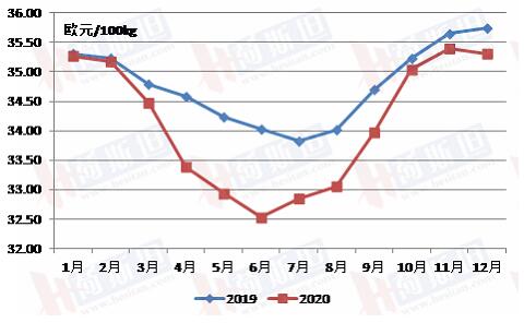 歐盟原料奶價格呈現(xiàn)鮮明的季節(jié)性特點,每個自然年度內(nèi)年初和年尾價格高,年中價格低,呈現(xiàn)“U”字形。2020年,受新冠肺炎疫情的影響,歐盟原料奶月度價格波動較大,除了年初的2個月價格接近2019年同期外,其他各月價格均明顯低于2019年同期。