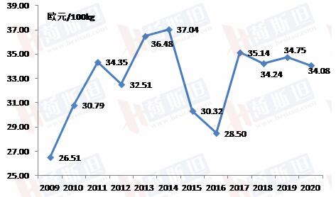 歐盟原料牛奶年度均價,2009-2020