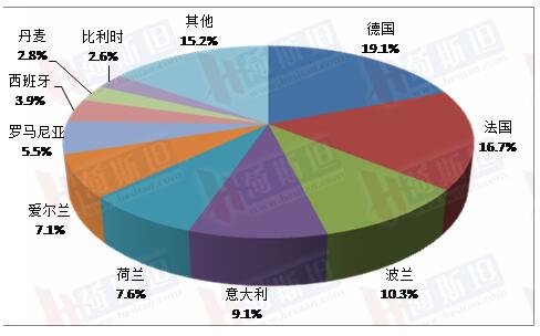 歐盟5個成員國牛奶產(chǎn)量超過1000萬噸,德國3254.9萬噸,同比增長0.3%,占歐盟總產(chǎn)量的22.5%;法國2466.0萬噸,同比增長0.5%,占17.1%;荷蘭1396.0萬噸,同比增長1.1%,占9.7%;波蘭1245.7萬噸,同比增長2.3%,占8.6%;意大利1189.5萬噸,同比下降0.6%,占8.2%。