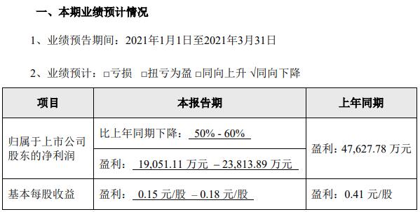 天邦股份4月15日發(fā)布2021年一季度業(yè)績預(yù)告,預(yù)計(jì)2021年第一季度歸屬于上市公司股東的凈利潤約1.91億元~2.38億元,同比下降50%~60%;基本每股收益盈利0.15元~0.18元。