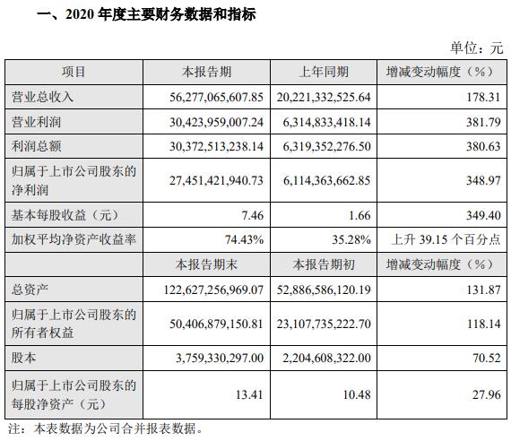 報(bào)告期內(nèi),公司實(shí)現(xiàn)營(yíng)業(yè)總收入5,627,706.56萬元,比上年同期增加178.31%;實(shí)現(xiàn)歸屬于上市公司股東的凈利潤(rùn)2,745,142.19萬元,比上年同期增加348.97%。