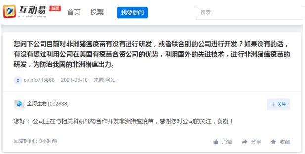 金河生物今日在回復(fù)投資者提問(wèn)時(shí)表示,公司正在與相關(guān)科研機(jī)構(gòu)合作開(kāi)發(fā)非洲豬瘟疫苗。