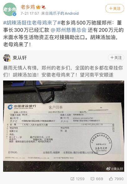老鄉(xiāng)雞官方微博稱,董事長束從軒的300萬元捐款已經(jīng)匯款,還有200萬元的米面水等生活物資正在對接捐助出口。束從軒在個人微博上表示,“鄭州的老鄉(xiāng)們,全國的老鄉(xiāng)都在牽掛你們!胡辣湯加油!安徽老母雞來了,望河南平安順遂。”