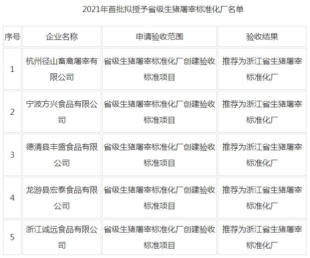 根據(jù)《農(nóng)業(yè)農(nóng)村部辦公廳關(guān)于深入推進(jìn)生豬屠宰標(biāo)準(zhǔn)化創(chuàng)建工作的通知》(農(nóng)辦醫(yī)〔2018〕26號(hào))和《浙江省農(nóng)業(yè)農(nóng)村廳關(guān)于深入推進(jìn)生豬屠宰標(biāo)準(zhǔn)化創(chuàng)建工作的通知》(浙農(nóng)牧發(fā)〔2019〕12號(hào))有關(guān)要求,經(jīng)屠宰企業(yè)申請(qǐng),市、縣農(nóng)業(yè)農(nóng)村部門(mén)逐級(jí)審核上報(bào),我廳組織專家對(duì)申報(bào)省級(jí)生豬屠宰標(biāo)準(zhǔn)化廠創(chuàng)建的企業(yè)進(jìn)行評(píng)審驗(yàn)收?,F(xiàn)將2021年首批擬授予省級(jí)生豬屠宰標(biāo)準(zhǔn)化廠的5家企業(yè)名單(詳見(jiàn)附件)予以公示,公示時(shí)間為2021年9月8日至2021年9月14日。