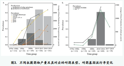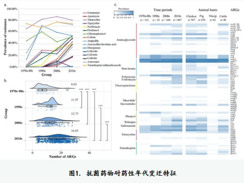 自上世紀(jì)70年代以來,我國畜禽養(yǎng)殖規(guī)模逐步擴(kuò)大,抗菌藥物的使用種類和用量不斷增加,導(dǎo)致動物源細(xì)菌耐藥日益突出,但對抗菌藥物的長期大量應(yīng)用如何加速細(xì)菌耐藥性的產(chǎn)生與傳播缺乏系統(tǒng)了解。明確這50年間細(xì)菌耐藥性時空演變的分子機(jī)制,有助于為我國制定科學(xué)合理的抗菌藥物使用政策,進(jìn)而保障公共衛(wèi)生安全。針對這一問題,作者從基因組學(xué)角度系統(tǒng)分析了我國20世紀(jì)70年代至2019年間動物源大腸桿菌的全基因組序列,發(fā)現(xiàn)耐藥基因平均攜帶數(shù)量升高了一倍(從8.05個到16.85個),多種藥物的耐藥基因流行率升高,包括介導(dǎo)獸醫(yī)(氟苯尼考和諾氟沙星)和人醫(yī)(多黏菌素、頭孢菌素和美羅培南)臨床中關(guān)鍵藥物耐藥的基因(圖1)。