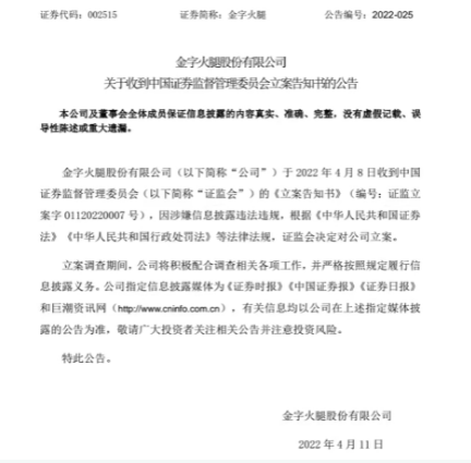 根據(jù)公告,金字火腿于4月8日收到證監(jiān)會(huì)的《立案告知書》,因涉嫌信息披露違法違規(guī),根據(jù)《中華人民共和國證券法》《中華人民共和國行政處罰法》等法律法規(guī),證監(jiān)會(huì)決定對(duì)公司立案。