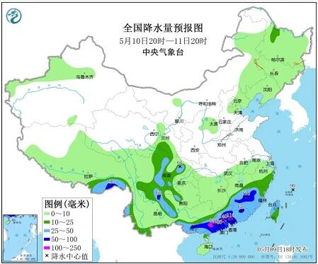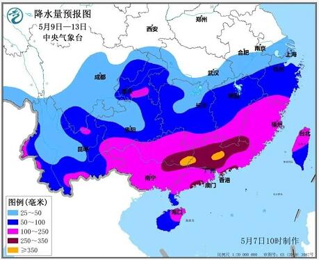 5月10日,降雨范圍將向東擴(kuò)展,雨勢更強,廣西、湖南、廣東、江西將普遍出現(xiàn)大到暴雨,局地大暴雨。