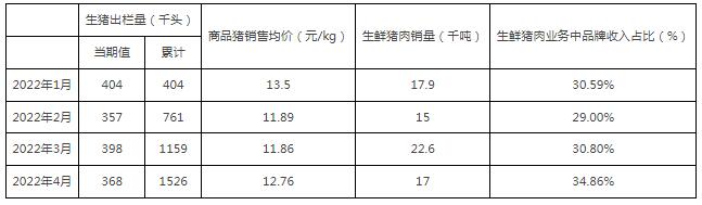 中糧家佳康5月10日公布2022年4月運營快報。公司4月生豬出欄量36.8萬頭;商品豬銷售均價人民幣12.76元/公斤,生鮮豬肉銷量1.70萬噸,生鮮豬肉業(yè)務(wù)中品牌收入占比為34.86%。