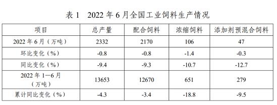 中國飼料工業(yè)協(xié)會(huì)最新數(shù)據(jù)顯示,2022年6月,全國工業(yè)飼料總產(chǎn)量2332萬噸,同比下降9.4%,其中豬飼料產(chǎn)量945萬噸,環(huán)比下降4.1%,同比下降12.4%。其他蛋禽飼料、肉禽飼料也處于同比下降的局面,僅水產(chǎn)飼料同比上漲11.8%。