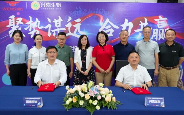 溫氏股份董事兼溫氏投資總裁趙亮(前排左一)、興嘉生物董事長黃逸強(前排右一)代表雙方簽署合作協(xié)議