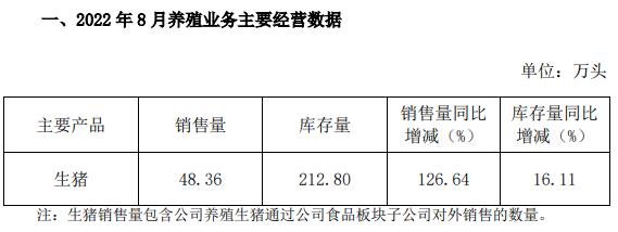 2022年8月,公司生豬銷售量48.36萬(wàn)頭,銷售量環(huán)比增長(zhǎng)12.68%,同比增長(zhǎng)126.64%。