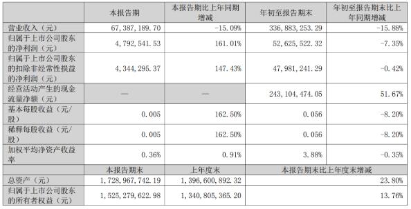 前三季度實現(xiàn)營業(yè)收入3.37億元,同比下滑15.88%;歸母凈利潤5262.55萬元,同比下降7.35%。