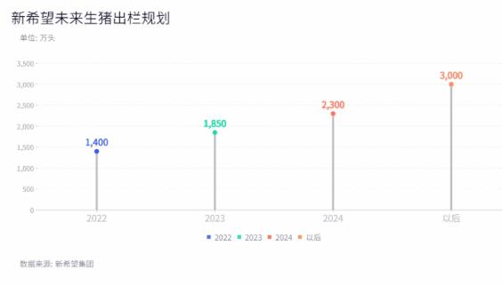 而已經(jīng)搶占第三位的新希望,也并不希望止步于此。根據(jù)其生豬出欄規(guī)劃,2022年目標(biāo)1400萬頭,2023年1850萬頭,2024年2300萬頭~2500萬頭,未來出欄量則會(huì)維持在3000萬頭左右。