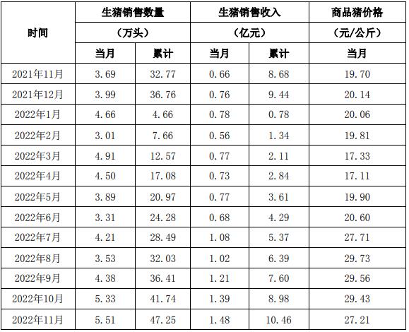 2022年11月份,公司商品豬銷售均價27.21元/公斤,環(huán)比下降7.53%。