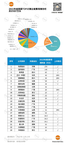 能繁母豬是養(yǎng)殖集團(tuán)厚積薄發(fā)的核心資源。根據(jù)新豬派調(diào)研,截至2022年底,我國TOP20豬企共計(jì)手握897萬頭能繁母豬,約占全國總量的1/5。能繁母豬超過10萬頭的企業(yè)有23家。