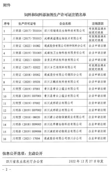 2022年12月27日,四川省農(nóng)業(yè)農(nóng)村廳發(fā)布公告,注銷四川恒瑞通達(dá)生物科技有限公司等16家飼料和飼料添加劑企業(yè)的生產(chǎn)許可證。