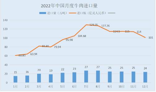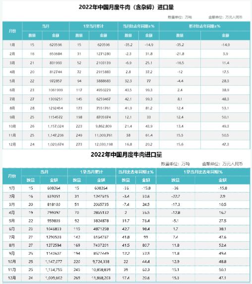 分類來看,12月份,我國牛肉(含雜碎)進口量24萬噸,環(huán)比下降1萬噸,同比增長了16.8%;進口額1020674萬元,同比增長了20.1%。去年1至12月份,累計進口量同比增長15.6%,進口額同比增長47.3%。牛肉進口量24萬噸,進口額1009602萬元,較2021年11月份幾乎持平;同比2021年,進口量增長17.4%,進口額增長20.6%。