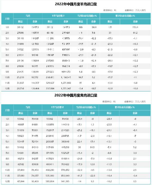 12月份羊肉進口環(huán)比小幅下跌,變化不大;禽肉進口量環(huán)比上月小幅上漲,同比2021年幾乎持平。具體如下: