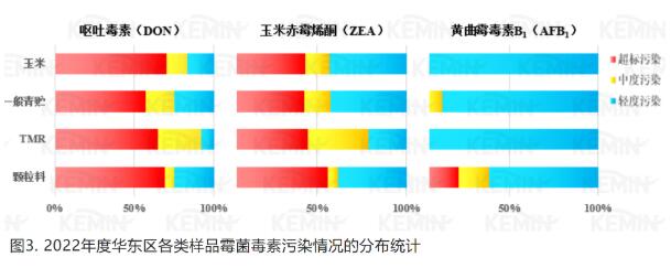 華東區(qū)和華北區(qū)中玉米赤霉烯酮污染程度與嘔吐毒素相當(dāng),其他地區(qū)中玉米赤霉烯酮相對更集中在一般青貯類樣品和TMR類樣品中,對其防治需要重視;