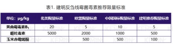 建明CLS參考我國《飼料衛(wèi)生標(biāo)準(zhǔn)》(GB13078-2017)制定的中國毒素限量標(biāo)準(zhǔn)、北美反芻養(yǎng)殖的毒素限量標(biāo)準(zhǔn)以及歐盟相關(guān)限量標(biāo)準(zhǔn),結(jié)合反芻現(xiàn)場經(jīng)驗總結(jié)等,綜合考量后對于反芻生產(chǎn)中毒素限量的推薦參考標(biāo)準(zhǔn)如表1。
