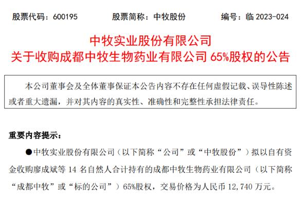 8月2日,中牧股份發(fā)布公告稱,擬以自有資金收購(gòu)廖成斌等14名自然人合計(jì)持有的成都中牧生物藥業(yè)有限公司(以下簡(jiǎn)稱成都中牧)65%股權(quán),交易價(jià)格為人民幣1.274億元。