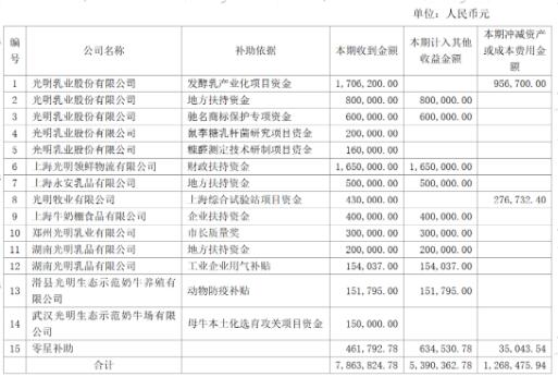 光明乳業(yè)(600597)于8月18日發(fā)布晚間公告稱,光明乳業(yè)股份有限公司(以下簡稱“公司”、“本公司”)及下屬子公司自2023年4月1日至2023年6月30日(以下簡稱“本期”)累計收到各類政府補助7,863,824.78元(數(shù)據(jù)未經(jīng)審計)。上述政府補助明細如下(10萬元以上單列,10萬元及10萬元以下合并計入“零星補助”):