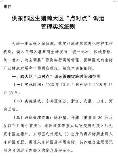 山東省畜牧獸醫(yī)局近日發(fā)布通知,自2023年12月1日至2025年11月30日,除種豬、仔豬(重量在30公斤及以下且用于育肥)、非洲豬瘟等重大動(dòng)物疫病無疫區(qū)和無疫小區(qū)生豬外,東部區(qū)外超過30公斤的商品豬禁止調(diào)入我省育肥,需進(jìn)入我省屠宰用生豬,其養(yǎng)殖企業(yè)經(jīng)登記后方可調(diào)運(yùn)至省內(nèi)定點(diǎn)屠宰企業(yè)。具體管理辦法見《供東部區(qū)生豬跨大區(qū)“點(diǎn)對點(diǎn)”調(diào)運(yùn)管理實(shí)施細(xì)則》(東部區(qū)聯(lián)防辦〔2023〕6號,附后)。