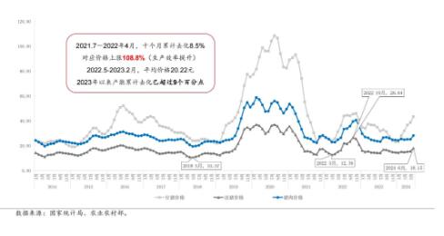 從2023年1月開始,產(chǎn)能開始去化,到2024年4月,產(chǎn)能從4,390萬(wàn)頭降到了3,986萬(wàn)頭,累計(jì)下降了9.2%??梢詫?duì)比產(chǎn)能去化幅度帶來(lái)價(jià)格上漲的高度的歷史上的經(jīng)驗(yàn)??杀刃员容^強(qiáng)的就是2022年那一波行情,當(dāng)時(shí)產(chǎn)能從4,564萬(wàn)頭降到4,177萬(wàn)頭,降到去化的幅度是8.5%。通過(guò)對(duì)比之后,發(fā)現(xiàn)現(xiàn)在產(chǎn)能是更低的,產(chǎn)能去化的幅度跟那一輪相比較也是更大的。也就是說(shuō),如果生產(chǎn)效率、消費(fèi)需求和市場(chǎng)情緒等其他所有的外部因素,假設(shè)都不變的情況下,理論上來(lái)講,這一輪價(jià)格上漲的強(qiáng)度要比2022年那波價(jià)格上漲的強(qiáng)度要強(qiáng)。